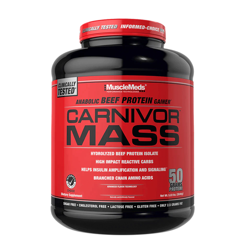 MuscleMeds advanced hydrolyzed CARNIVOR Beef Protein Isolate provides the power of beef at the speed of whey, delivering rapid absorption of high concentrations of amino acids without the lactose, allergens, fat, cholesterol and other problems associated with dairy products.* This pure beef protein isolate is also 350% more concentrated in amino acids than steak and more concentrated than whey. Plus CARNIVOR MASS is enhanced with additional BCAAs for even greater anabolic power!*